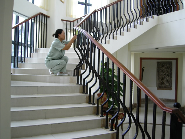 5、 門(mén)及框的保潔:把毛巾疊成方塊,從上到下擦拭,去掉膠水點(diǎn)等污漬,擦拭門(mén)框、門(mén)角等易被路忽視的地方,擦拭后,噴上家私蠟。
